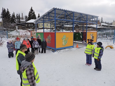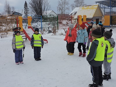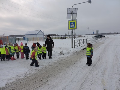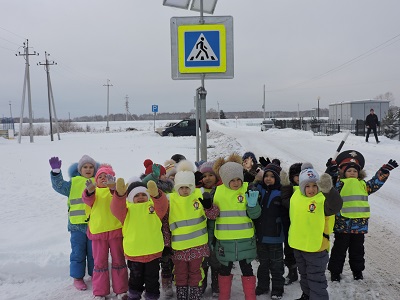 Совместно с воспитанниками старшей группы провели экскурсию к дорожному переходу, где повторили правила перехода через проезжую часть.