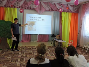 7 декабря руководитель физического воспитания Мосеевский Е.П. представил вниманию коллег консультацию «Зрительная гимнастика в ДОУ». Евгений Петрович рассказал о значении гимнастики для глаз, познакомил коллег с задачами и методикой применения.