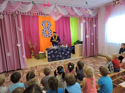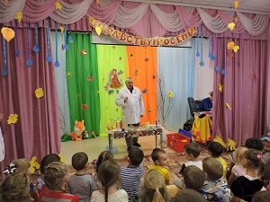 27 октября агентство событий «Театра» представило вниманию наших воспитанников познавательное научное шоу. Любопытный профессор показал детям яркие химические опыты. Дети приняли активное участие в проведении опытов, внимательно следили за коварствами профессора. По окончанию мероприятия дети делились впечатлениями с товарищами и педагогами.