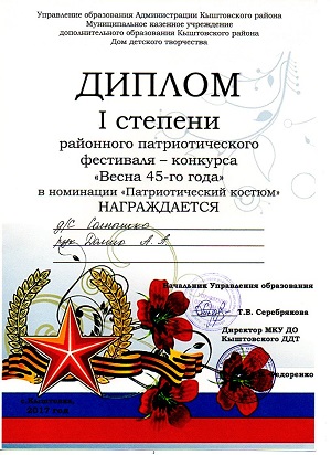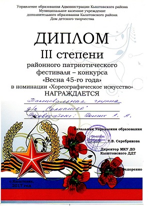 3 мая воспитанники средней и старшей групп нашего детского сада приняли участие в районном фестивале-конкурсе «Весна 45-го года». В номинации «Хореографическое искусство» наша танцевальная группа получила диплом 3 степени. В номинации «Патриотический костюм» диплом 1 степени. Все участники конкурса получили сертификаты участников.