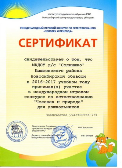Поздравляем воспитанников старшей группы «Радуга» за активное участие и хорошие результаты в международном игровом конкурсе «Человек и природа» для дошкольников.
