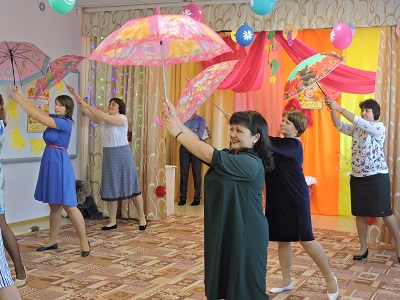 Выступали не только дети, но и взрослые. Помощники воспитателей исполнили лирический танец с платками, технический персонал во главе с завхозом исполнили танец «Калинка», а педагогический коллектив поразил всех танцем «Леди совершенство».