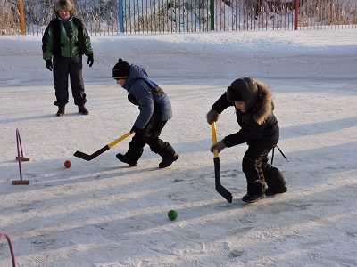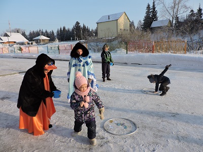 Воспитанники старшей и подготовительных групп с хорошим настроением собрались на спортивной площадке детского сада, захватив с собой: клюшки, санки, лыжи, удочки.