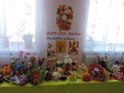 В музыкальном зале была организована выставка поделок "Букет для Мамы". Каких только букетов не было: розы, тюльпаны, лилии, ваза с ромашками, открытки с цветами и даже букеты из конфет. Родители и дети творчески отнеслись к выставке и изготовили удивительные, небывалой красоты работы, которые стали не только сюрпризом для мам, но и украшением праздника.