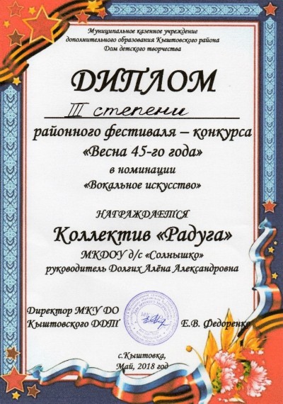 Вокальная группа «Радуга» исполнили песню «9 мая весна», награждены Дипломом Лауреатов III степени |